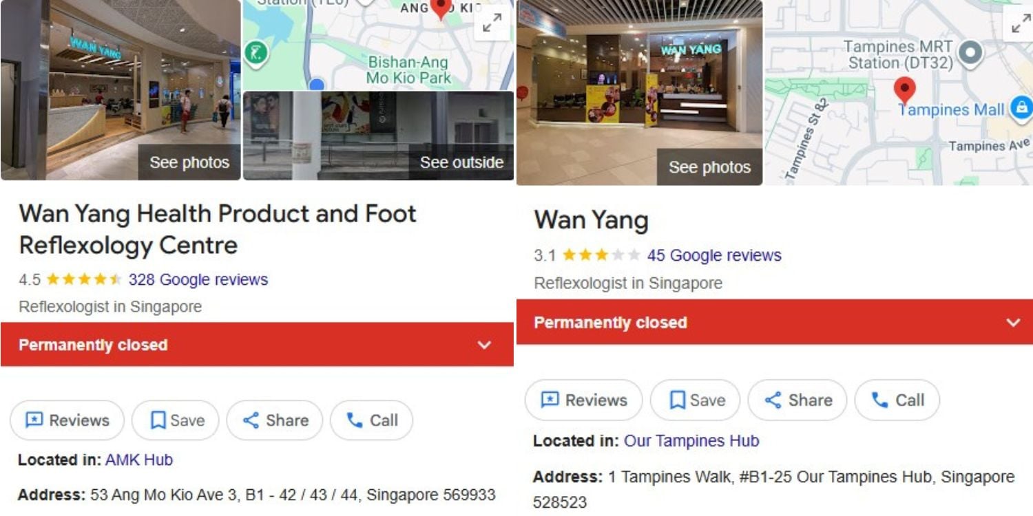 Checks on Google showed that there were five Wan Yang outlets: Thomson Plaza, HarbourFront Centre, AMK Hub, One Tampines Hub, and Parkway Parade. All listings showed the outlets as either temporarily or permanently closed.