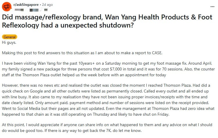 The Consumers Association of Singapore (CASE) has so far received 15 complaints about Wan Yang Health Products and Foot Reflexology. The chain abruptly closed all its outlets.