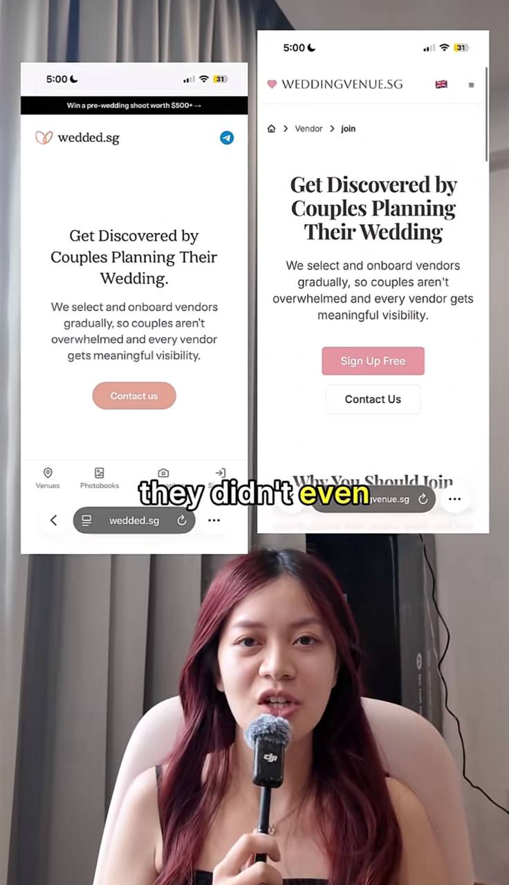“Did one of Singapore’s biggest wedding companies just copy our website?” she asked in the clip.