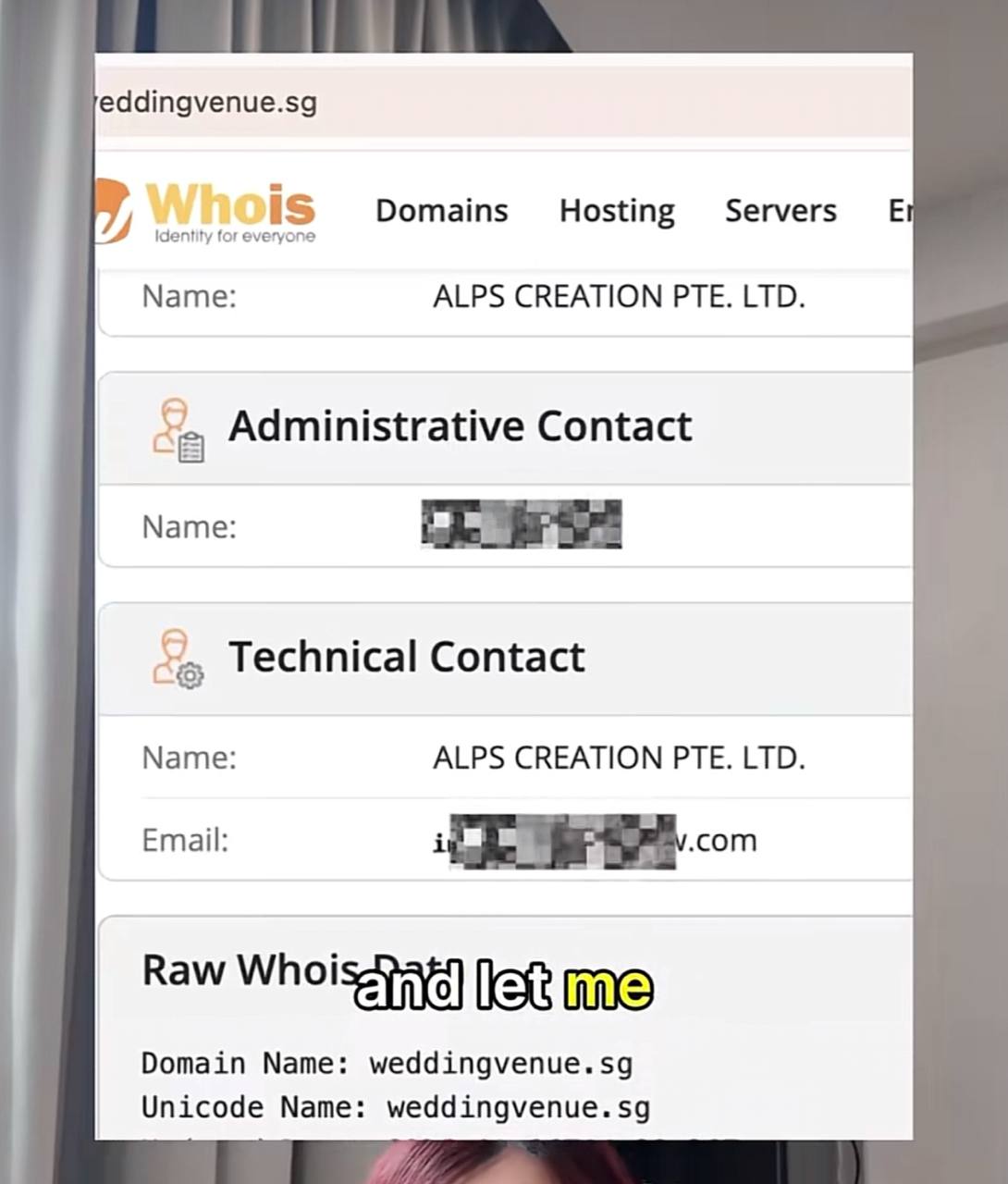 According to Alyssa, checks show that the owner of the website and the Weddingvenue.sg domain is ALPS Creation Pte Ltd.