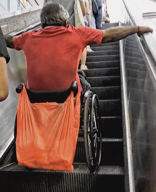 A video shared by Mr Deng shows the senior gripping both handrails as his wheelchair balances precariously on the escalator steps, with an orange plastic bag hanging from the handles.