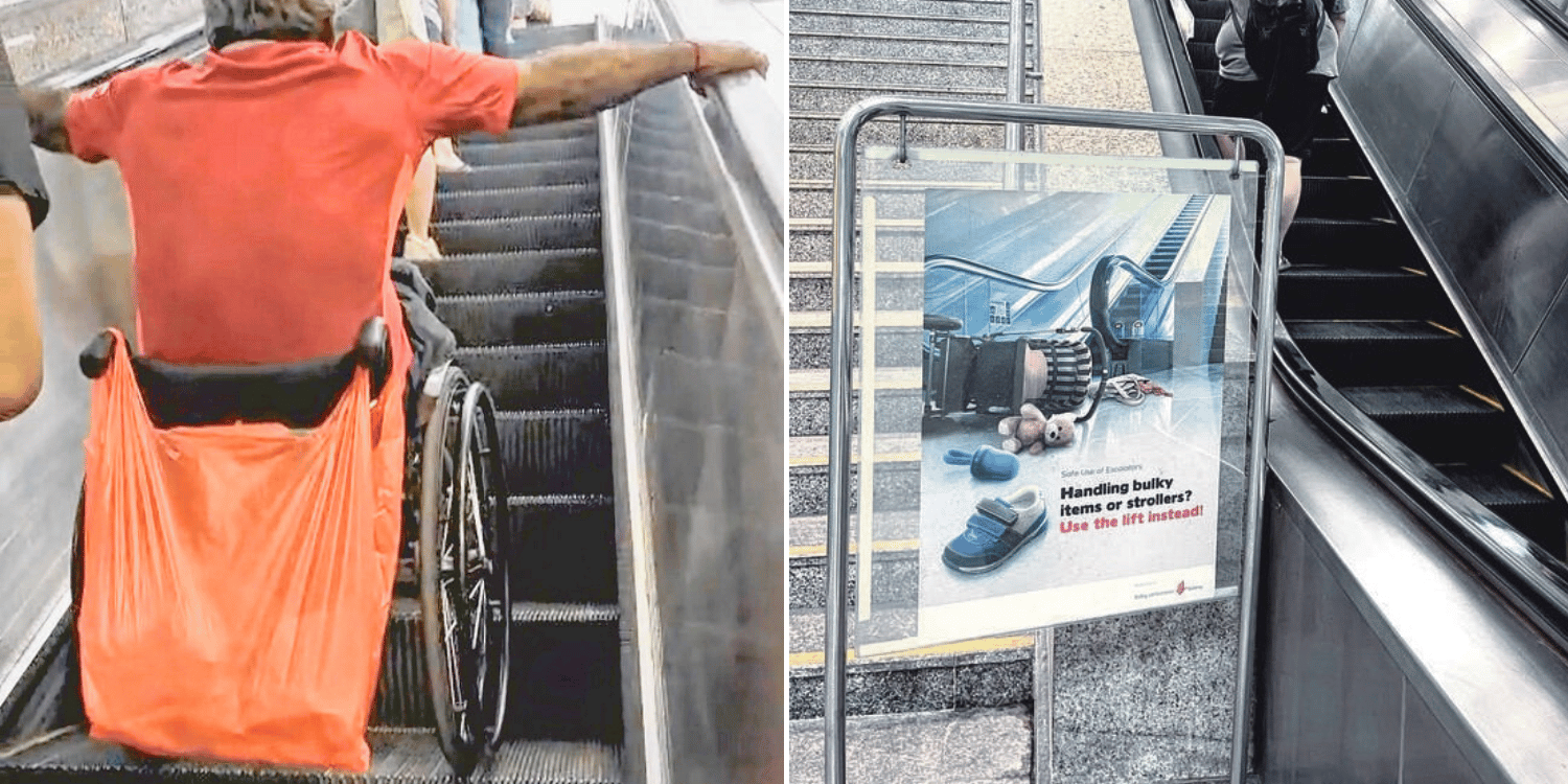 A source at Bugis MRT station told Shin Min Daily News that despite signs advising those with bulky items to use the lift, people are seen taking the escalator with wheelchairs or prams almost every day.
