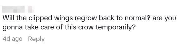 One TikTok user also asked whether the clipped wings would grow back, and whether the OP planned to care for the crow in the meantime.