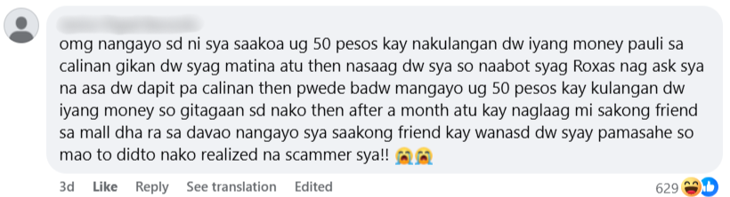 Translation: OMG, she also asked me for 50 pesos because she didn’t have enough to go back to Calinan. She said she came from Matina and got lost, then asked me for 50 pesos in Roxas. I gave her money, but a month later she approached my friend at a Davao mall with the same excuse. That’s when I realised she was a scammer!