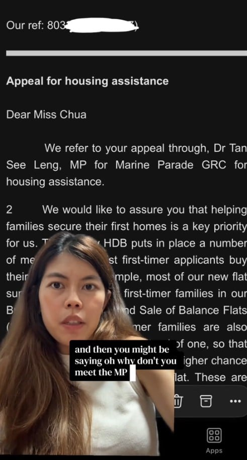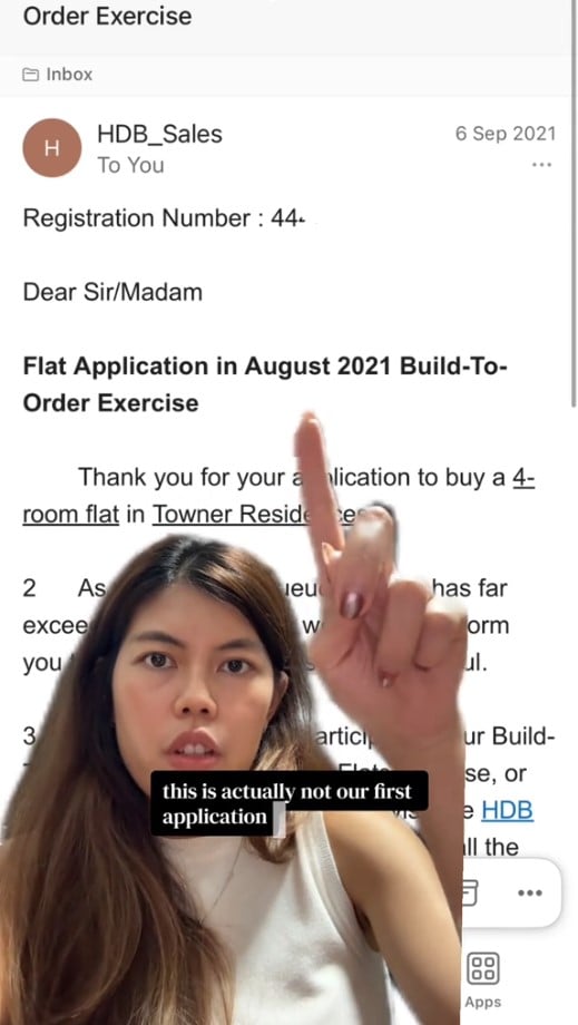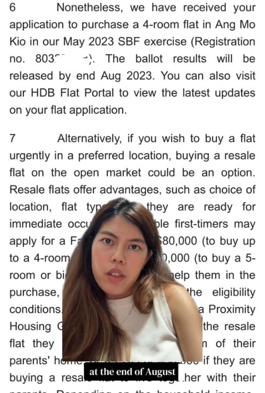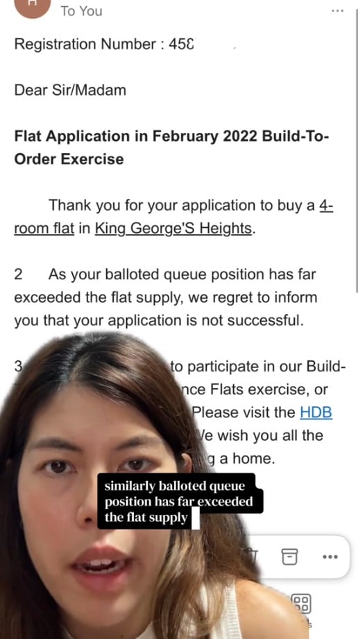 A woman who took to TikTok earlier this month to say that she had failed to get a Build-To-Order (BTO) flat after multiple applications has received a reply from HDB, explaining what happened.