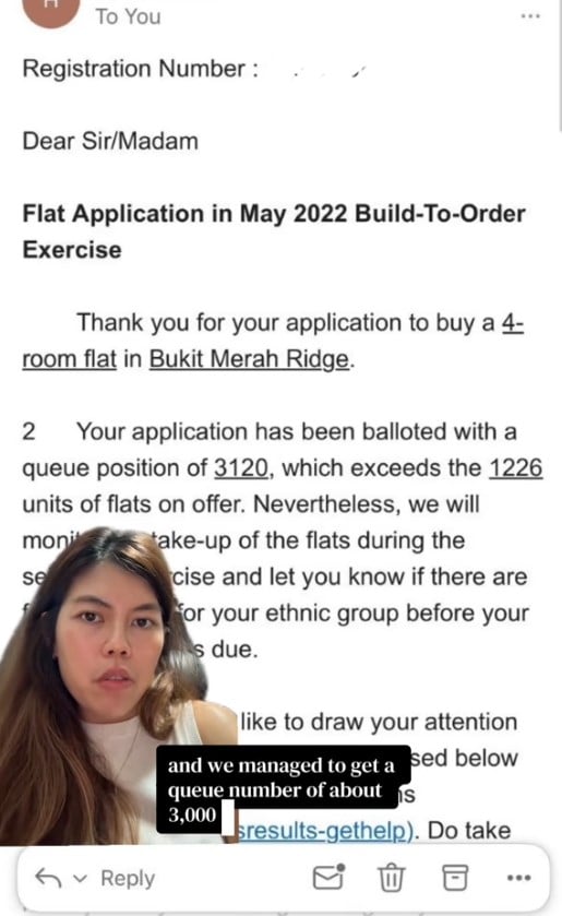 However, she pointed out that she balloted for a four-room flat in the Bukit Merah Ridge project in May 2022 and was given a queue number of 3,120 — more than the 1,226 units available.