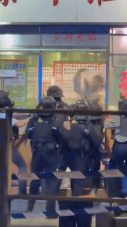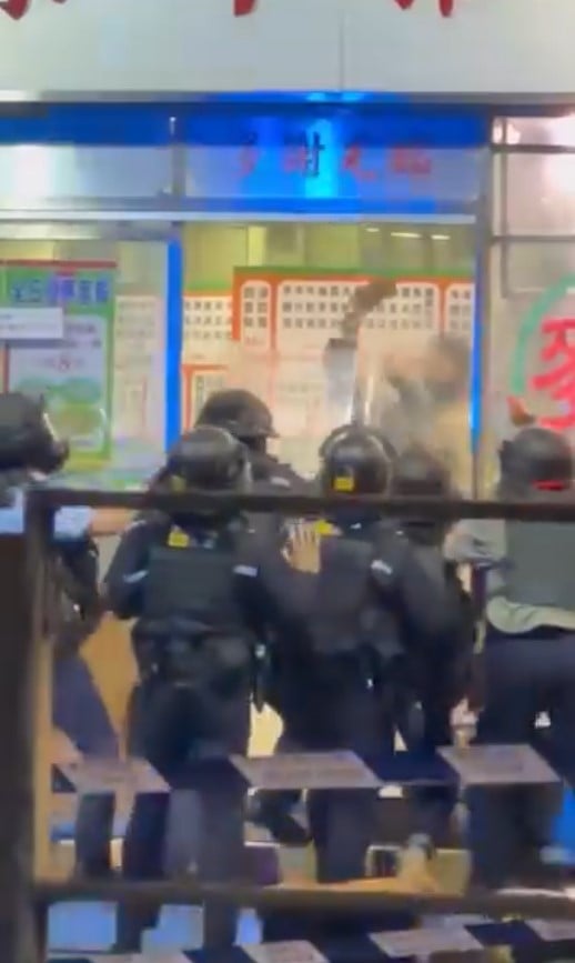As soon as the sliding door opened, she started hacking at the officers’ riot shields, to the amazement of onlookers.
