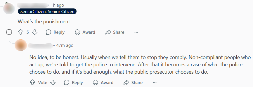 Non-compliant people who act up, we’re told to get the police to intervene. After that it becomes a case of what the police choose to do, and if it’s bad enough, what the public prosecutor chooses to do.