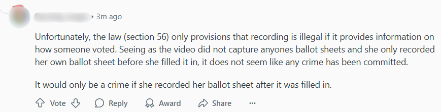 One user said that, under the law, filming one’s ballot is only illegal if it was filled in, therefore exposing who they had voted.