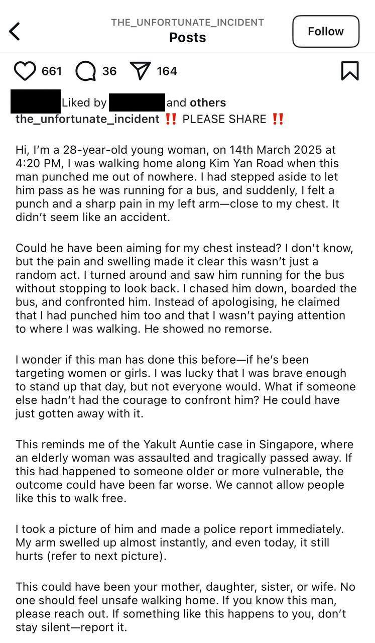 The woman cited a previous case in Singapore where a 70-year-old Yakult auntie died after being punched in a lift in Sengkang, noting that the outcome of her attack would’ve been far worse if it had happened to someone older or more vulnerable, adding:
