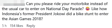 “Can you please ride your motorbike instead of the usual car to enter on National Day Parade?” an Instagram user joked.