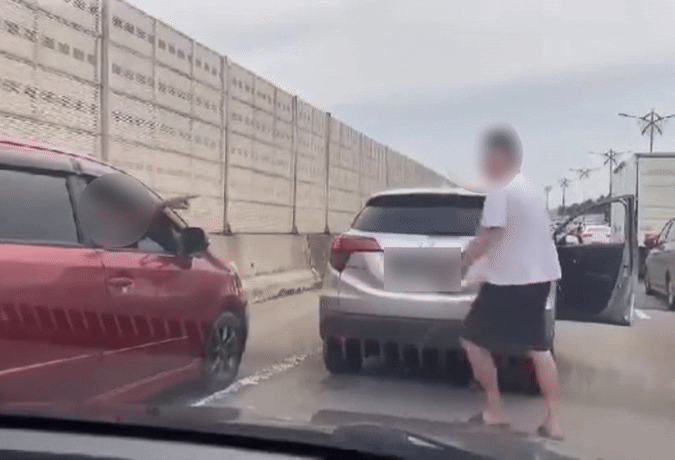 Footage posted on social media on Monday (10 Mar) shows the driver of a silver Honda HR-V standing next to the driver’s side of a red car while holding a long stick.