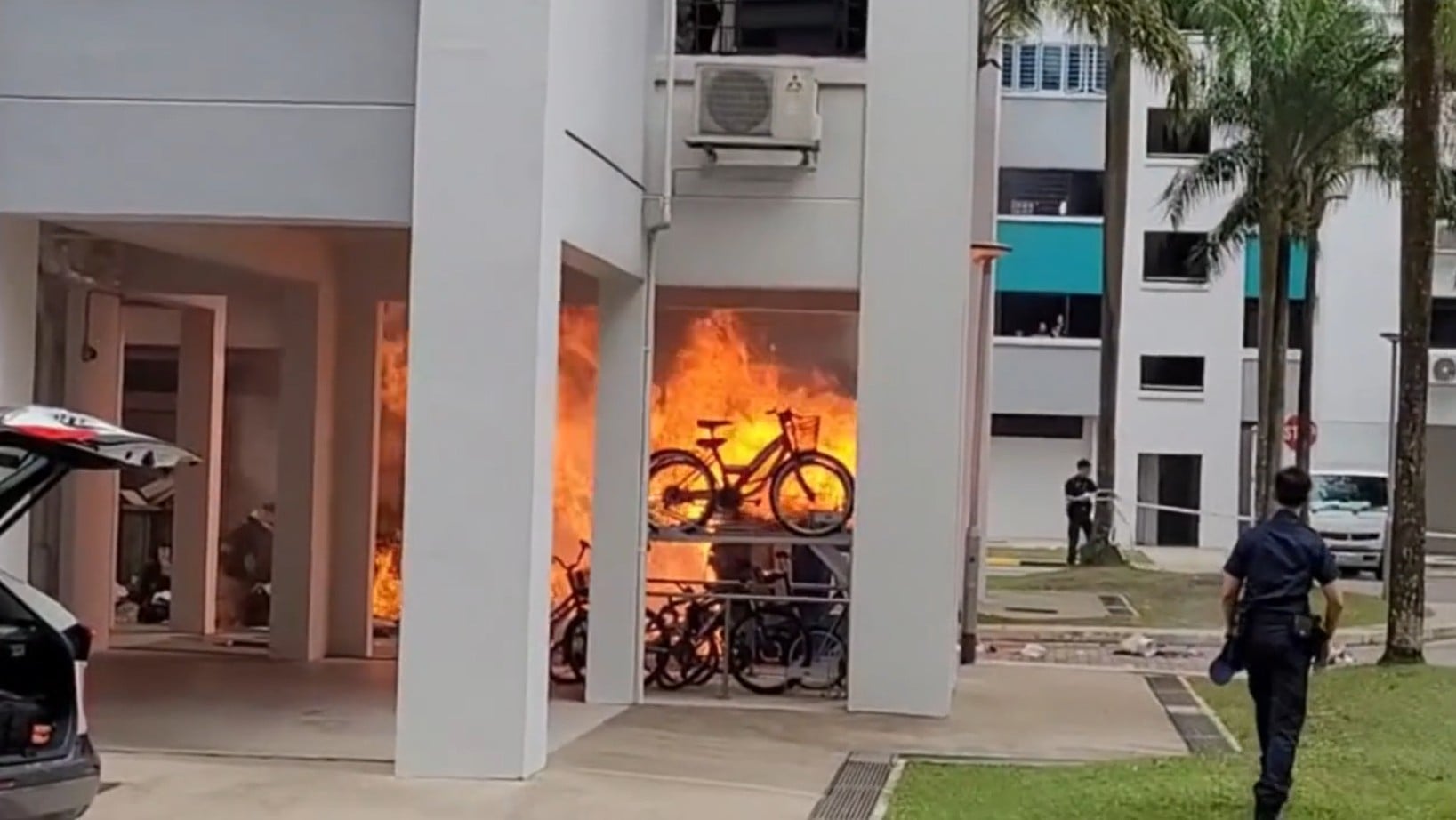 A nearby resident recorded the dramatic scene, showing a pile of garbage engulfed in flames at the loading bay of Block 616 Woodlands Avenue 4.