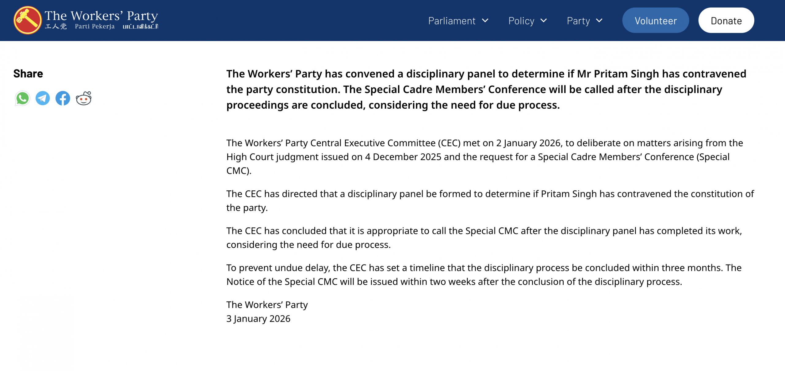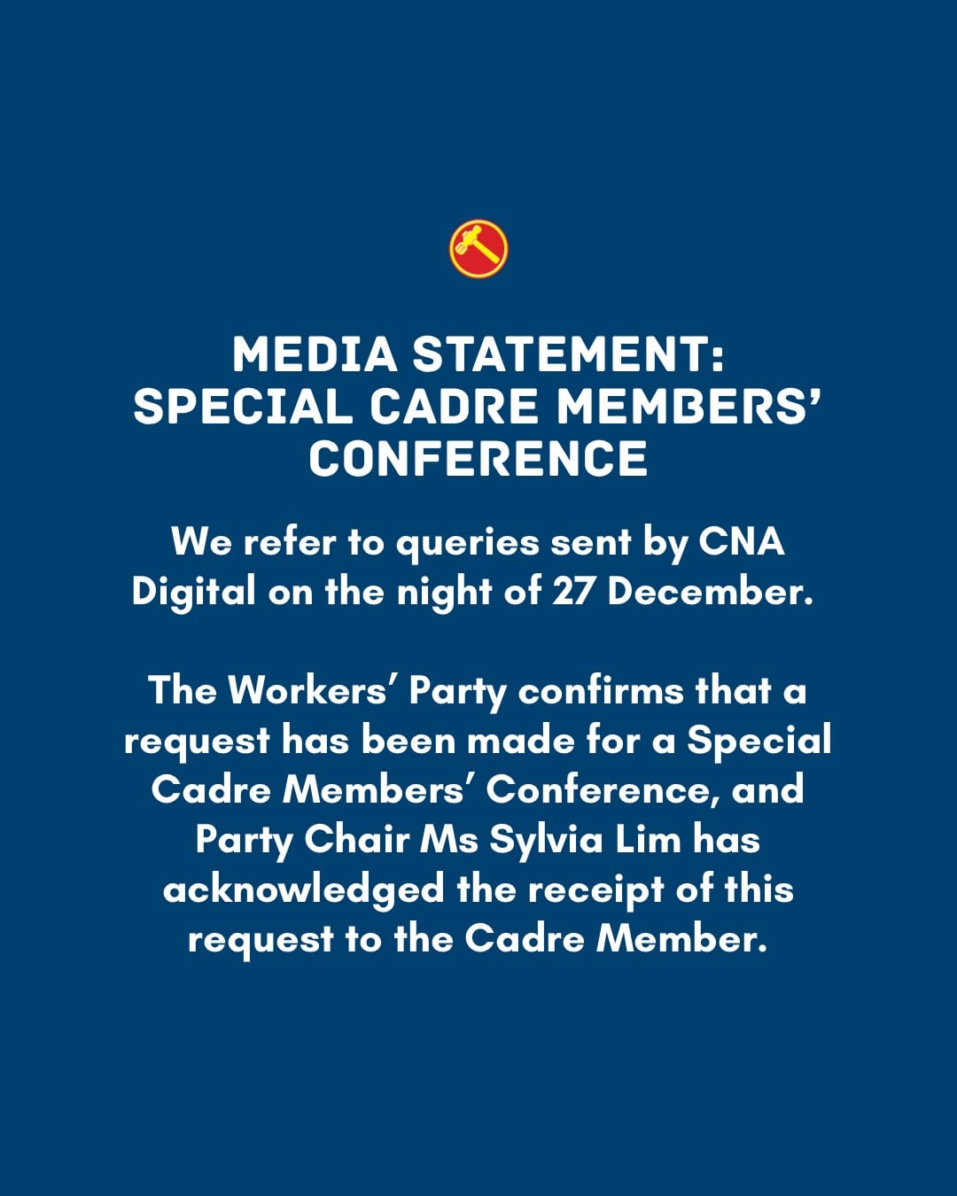 On 28 Dec 2025, WP had said that a request to hold a special cadre members’ conference had been submitted, and that party chairwoman Sylvia Lim had acknowledged the request.