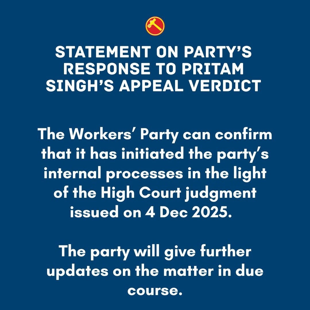 In a media statement issued on Saturday (3 Jan), WP said its Central Executive Committee (CEC) met on Friday (2 Jan) to deliberate on matters arising from the High Court judgment dated 4 Dec 2025, which upheld Mr Singh’s conviction on two counts of lying to a parliamentary committee.