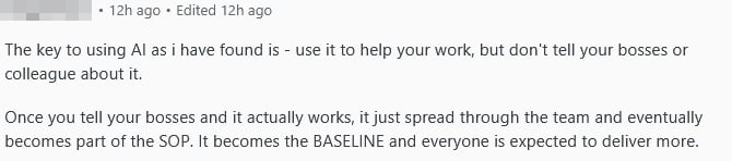 Others highlighted how the introduction of AI often led to higher expectations from bosses, with one user noting that simply introducing AI into the workplace raised the bar for entire teams.