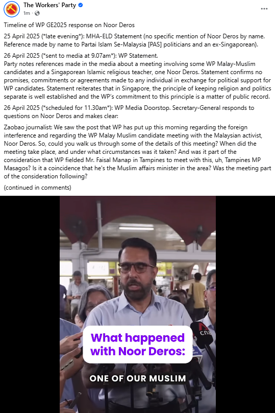 Later on Tuesday (14 Oct), WP published a Facebook post titled ‘Timeline of WP GE2025 Response on Noor Deros’, detailing how events unfolded.