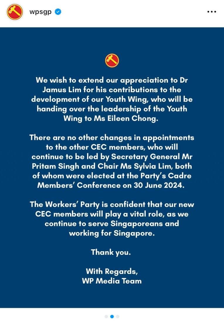 The WP confirmed there were no changes to the rest of the CEC lineup. The party continues to be led by Secretary-General Mr Pritam Singh and Chair Ms Sylvia Lim, both of whom were re-elected at the party’s Cadre Members’ Conference last June.