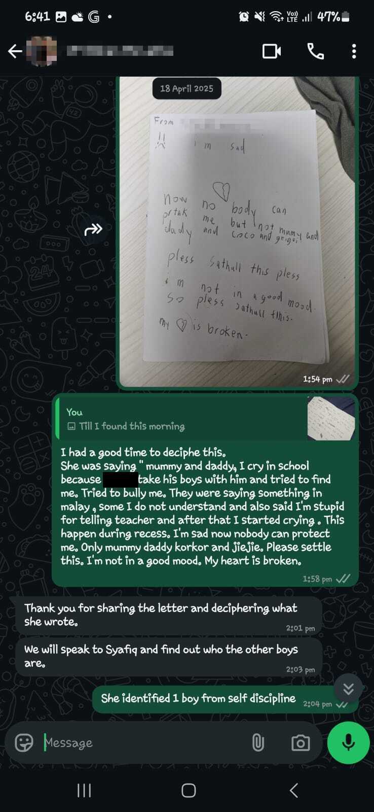 The family told MS News they are not demanding perfection from schools, but accountability. After repeated incidents of alleged bullying, harassment, and inaction, they say their trust in Xishan Primary has been “severely eroded”.