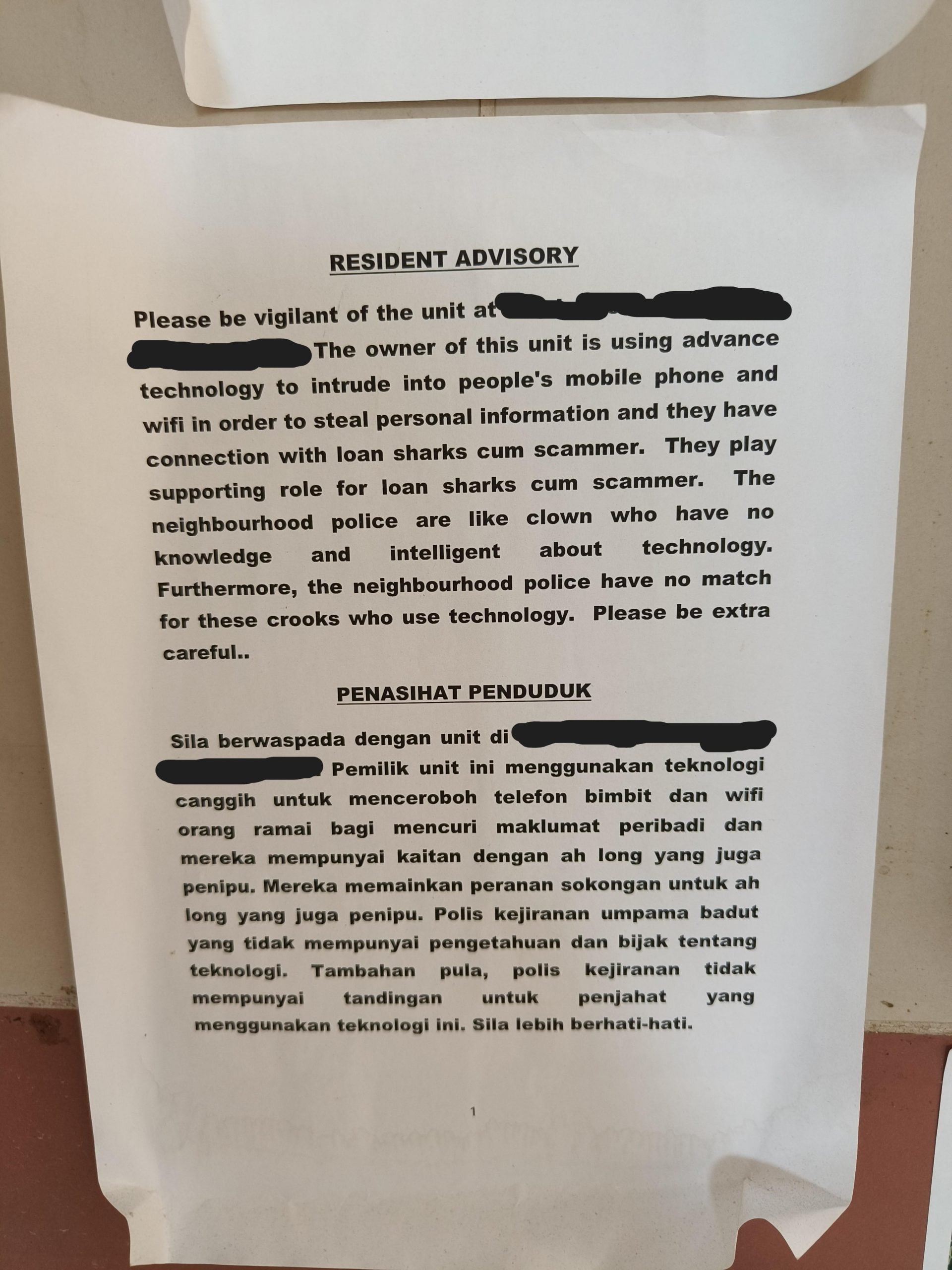 An unusual sign pasted at an HDB lift lobby in Yishun has raised eyebrows after warning residents about a neighbour allegedly using “advanced technology” to hack phones.