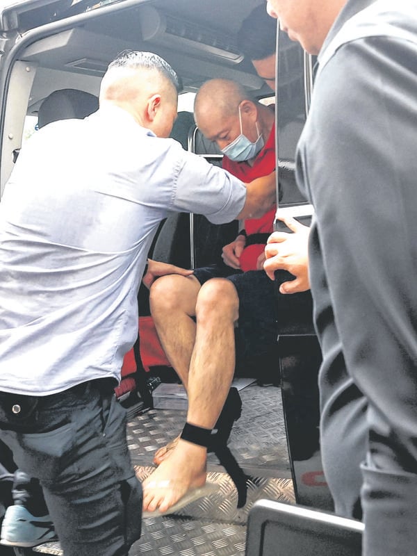 The elderly man was dressed in a red polo shirt and black shorts, alongside a face mask. Black restraints bound his limbs, while several officers held onto him at all times.