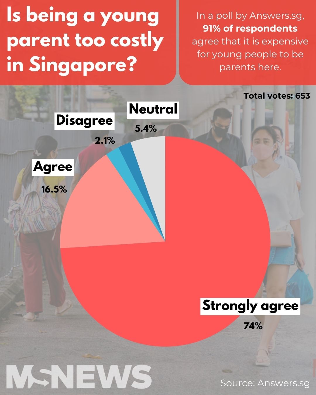 Of the 653 respondents, about 91% agreed that it is too expensive to be a young parent here.