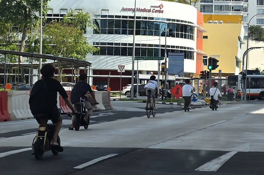The photos showed several boys riding down Jurong West Street 64, with four on e-bikes and one on a bicycle.