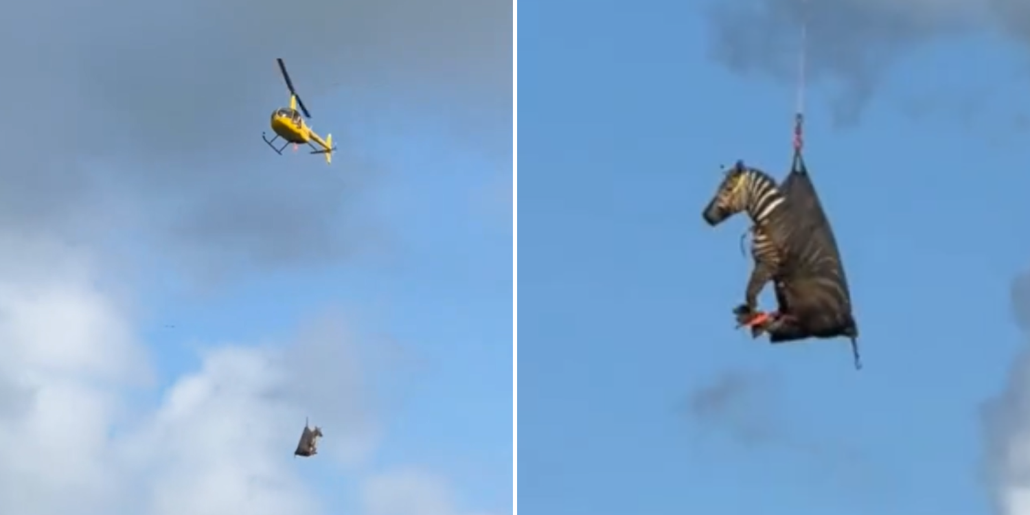Footage from the rescue showed the zebra wrapped in netting with its head poking out.