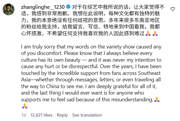 On Tuesday (10 March), Zhang posted an apology in the comments section of an Instagram post.