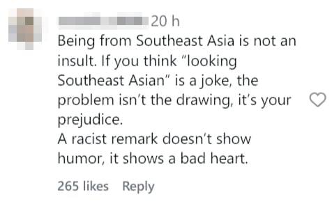 One user commented that being from Southeast Asia should not be treated as an insult, adding that if someone sees “looking Southeast Asian” as a joke, it reflects prejudice rather than an issue with the drawing.